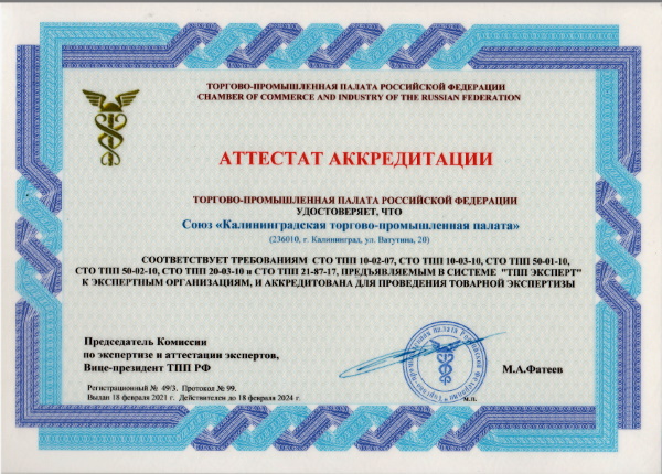 Союз «Калининградская торгово-промышленная палата" соответствует требованиям, предъявляемым к организациям, аккредитованным в Системе «ТПП Эксперт» ТПП РФ и СТО ТПП 10-02-07, 10-03-10, 50-01-10, 50-02-10, 20-03-10, 21-87-17.