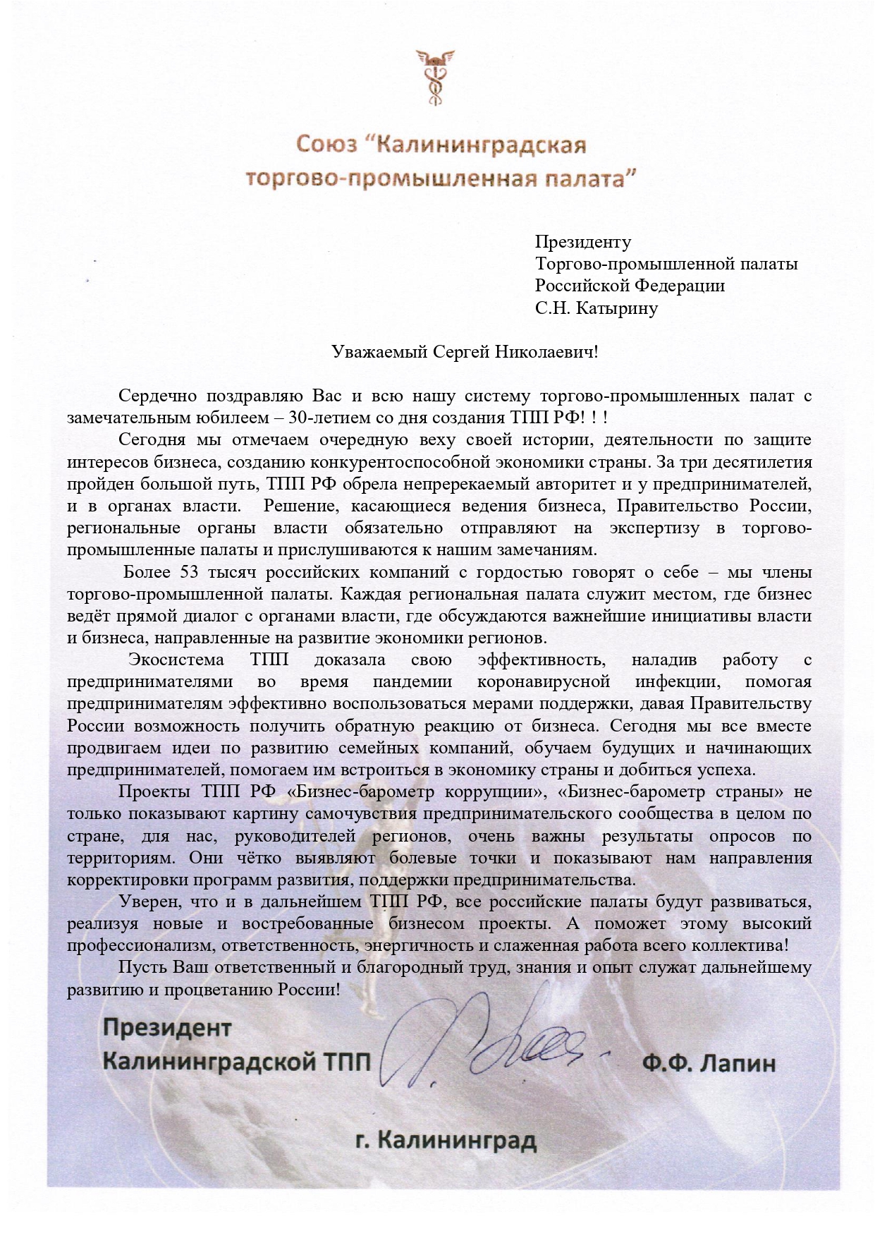 Сердечно поздравляю Вас и всю нашу систему торгово-промышленных палат с замечательным юбилеем – 30-летием со дня создания ТПП РФ! ! !
