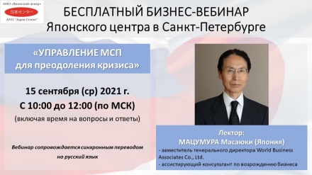 Союз «Калининградская торгово-промышленная палата информирует, что 15 сентября 2021 г. в 10:00 мск Японский центр в Санкт-Петербурге проводит бесплатный бизнес-вебинар «Управление МСП для преодоления кризиса»